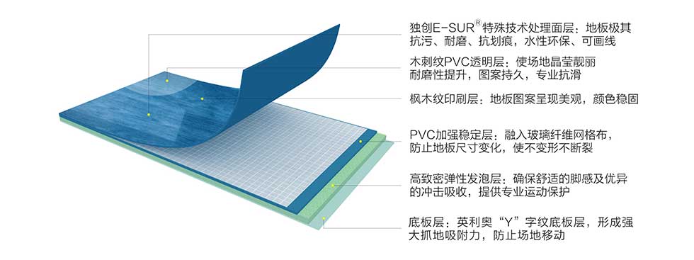 面层为透明PVC与枫木纹印刷层相得益彰,使流畅的木纹线条与肌理呈现立体,场地晶莹亮丽、自然美观、固色持久;另外形成复合耐磨结构,提升地板耐磨性与抗冲击性。