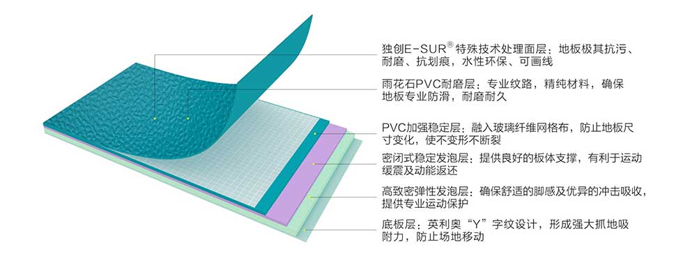 优质材料、超厚的耐磨层厚度、考究的“雨花石”纹理相互作用,使地板面层具有充足且适度的摩擦力,有效防止运动滑倒性伤害,同时还保证移动及原地转动的灵活性,确保运动安全及尽情跳动的运动发挥。