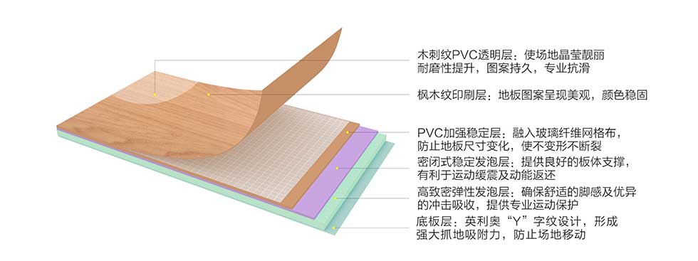PVC透明面层与枫木纹印刷层相得益彰,流畅的木纹线条与肌理呈现立体,使场地晶莹亮丽,自然美观,固色持久;另外形成复合耐磨结构,提升地板耐磨性与抗冲击性。