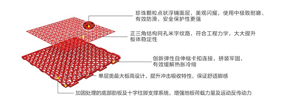米字型加厚表面支撑及正三角肋板连接稳定结构,地板横向空间定尺稳定,纵深方向稳固抗冲击。