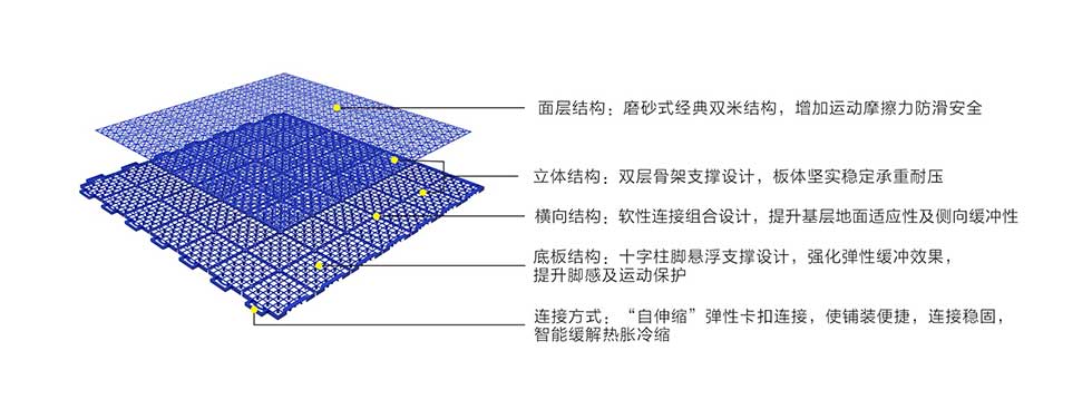 ▶使场地整体稳定性更强,避免拼缝多导致场地松动、滑扣受力瞬间泄力崴脚,保障稳定且均衡的回弹动力;