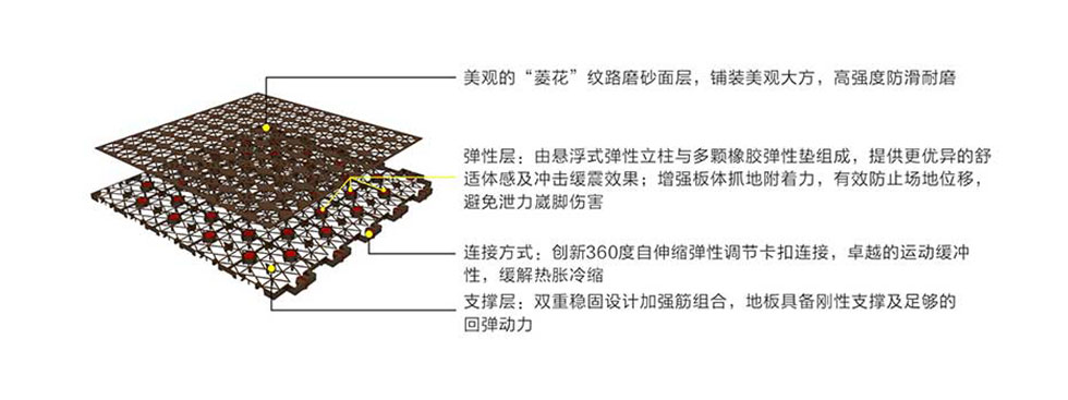 边缘科学设计定位式弹性锁扣,使板体连接简单精准,360度自我伸缩调节,保障更卓越的运动缓冲效果,解决热胀冷缩问题。
