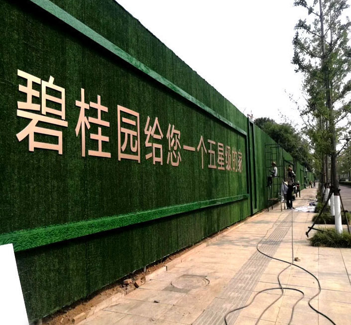 假草皮围挡,一般是指在铁皮、彩钢板、水泥墙、砖墙等围挡上粘贴人造草坪,在此基础上设置广告字标语等,具有绿色环保、吸音防尘等功能。