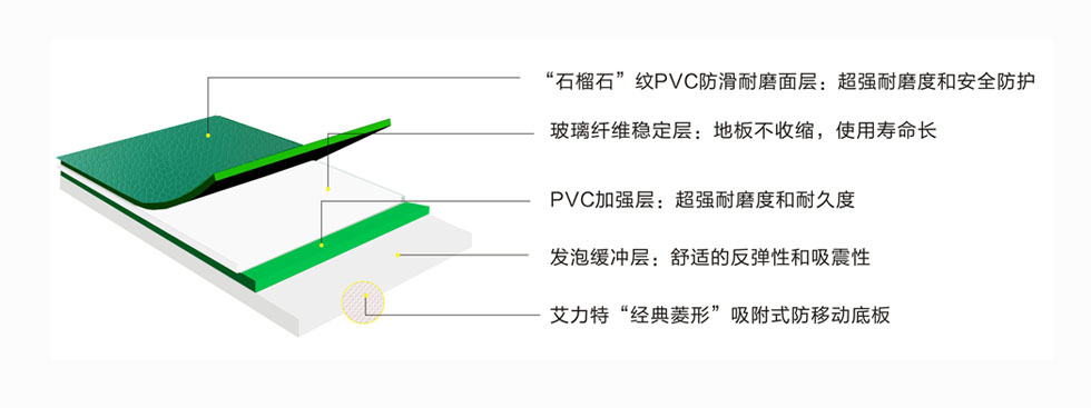 艾力特地胶底板独特的“菱形”纹吸附技术,使场地形成强大的抓地力,防止运动冲击造成的场地偏移。